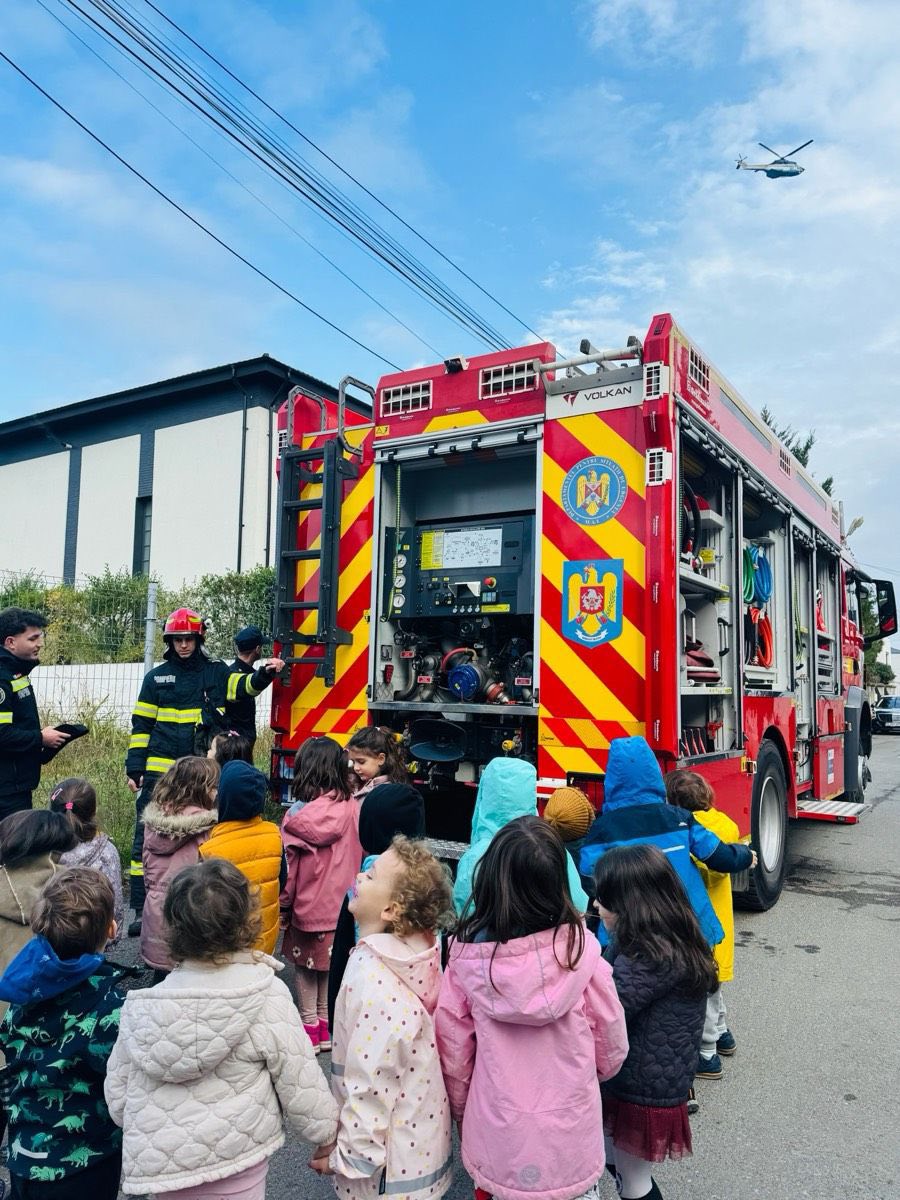 Pompierii le-au arătat copiilor uniformele lor speciale și le-au explicat scopul fiecărei părți, de la cască și mănuși de protecție, până la masca și rezervorul de oxigen care îi ajută să respire în siguranță în timpul unui incendiu. Copiii au fost fascinați să afle cum fiecare piesă de echipament îi menține pe pompieri în siguranță și pregătiți să-i ajute pe ceilalți.După aceea, copiii au observat și explorat mașina de pompieri! Pompierii le-au prezentat copiilor diferitele unelte și compartimente din mașină, le-au explicat cum folosesc furtunul de apă pentru a stinge incendiile și au vorbit despre rolul lor în menținerea siguranței comunității noastre. De asemenea, au împărtășit sfaturi valoroase de siguranță, despre ce anume ar trebui să facem în caz de urgență și cât de important este să rămânem calmi și să cerem ajutor de la adulți de încredere.