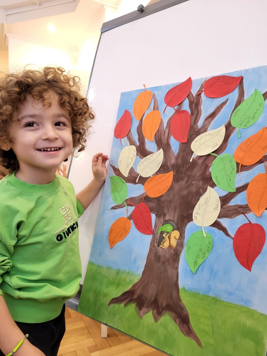 Am încheiat cu un proiect colectiv, „Copacul faptelor bune”, când fiecare dintre copii au spus care sunt cele mai importante lucruri pentru ei într-o prietenie, apoi au completat peisajul de toamnă cu aceste frunze colorate.