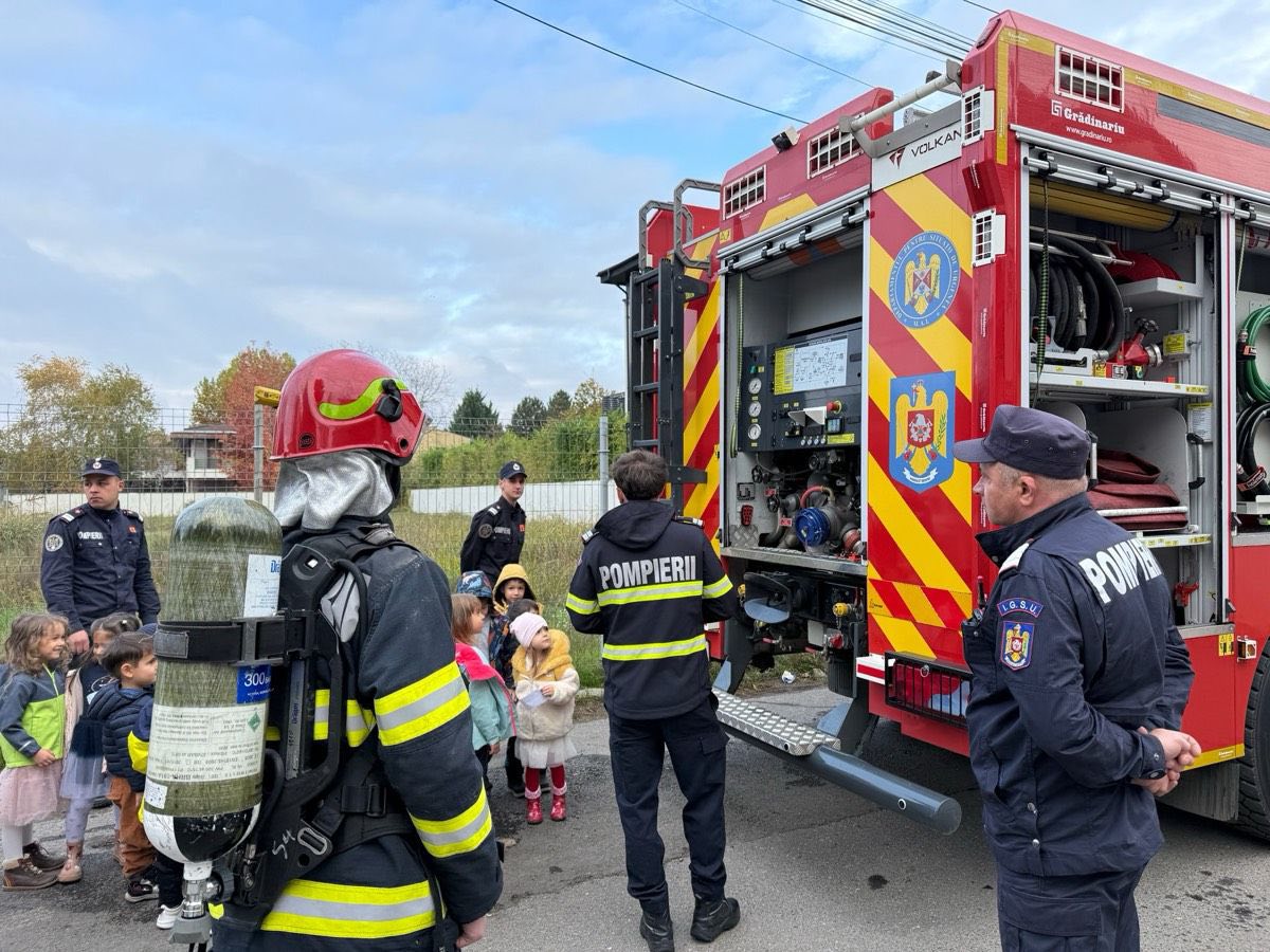 Pompierii le-au arătat copiilor uniformele lor speciale și le-au explicat scopul fiecărei părți, de la cască și mănuși de protecție, până la masca și rezervorul de oxigen care îi ajută să respire în siguranță în timpul unui incendiu. Copiii au fost fascinați să afle cum fiecare piesă de echipament îi menține pe pompieri în siguranță și pregătiți să-i ajute pe ceilalți.După aceea, copiii au observat și explorat mașina de pompieri! Pompierii le-au prezentat copiilor diferitele unelte și compartimente din mașină, le-au explicat cum folosesc furtunul de apă pentru a stinge incendiile și au vorbit despre rolul lor în menținerea siguranței comunității noastre. De asemenea, au împărtășit sfaturi valoroase de siguranță, despre ce anume ar trebui să facem în caz de urgență și cât de important este să rămânem calmi și să cerem ajutor de la adulți de încredere.